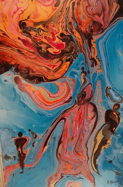She jumps at the sight of her creative personality free of schools, tendencies and even background. Hardly anyone could give her lessons on a technique and artistic results that did not exist. Her painting is virgin and comes from the heart, not the brain.
