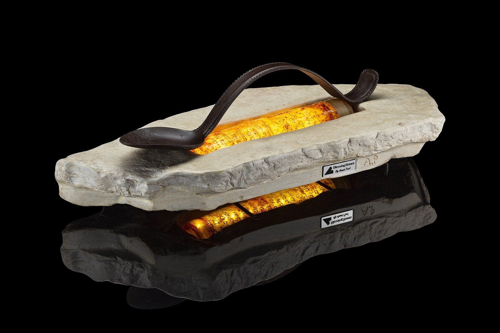 Recently, in honour of the opening of Uri Geller’s new museum in Old Jaffa, Israel, I designed a unique mezuzah that represents him. The mezuzah is also a light fixture and is unique—one of a kind in the world. At 30 kg and made of Jerusalem stone, it’s extraordinary in terms of size and design.