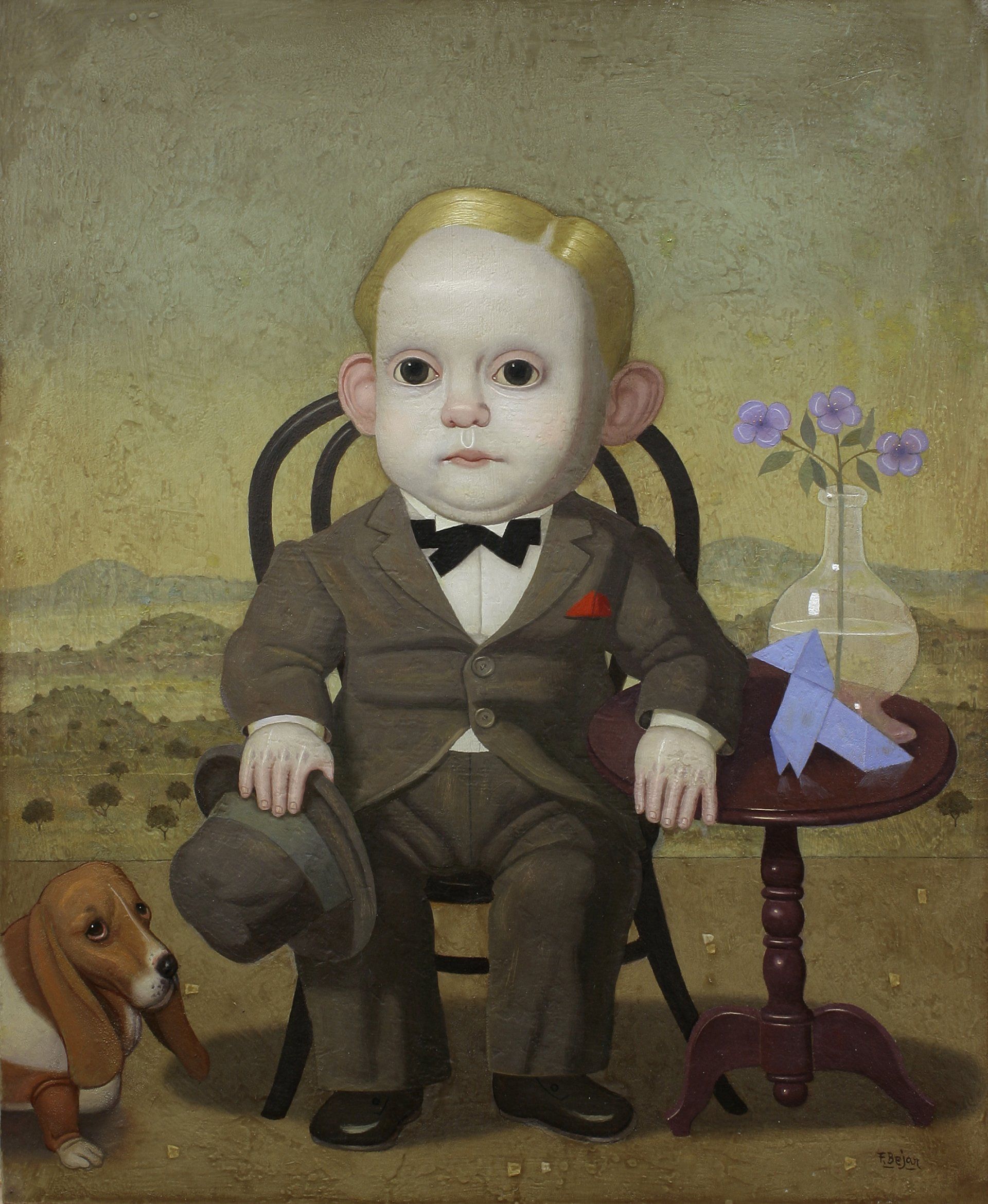 To create this symbolism, Béjar mainly uses his personages, those ‘poisoned chocolates’ as he likes to call them: children who have lived life and have returned, who instead of progressing have returned to childhood. They are sweet children but at the same time they have the bitterness of life reflected on their faces and bodies. Figures that ironize with their gaze, animals whose gazes resemble those of people. They are ‘little ones’ who already carry the story of a life behind, and have returned to youth with their joys and troubles, personages who carry bitterness inside, a kind of beings who were born old and have ended up ‘Disinherited from history’.