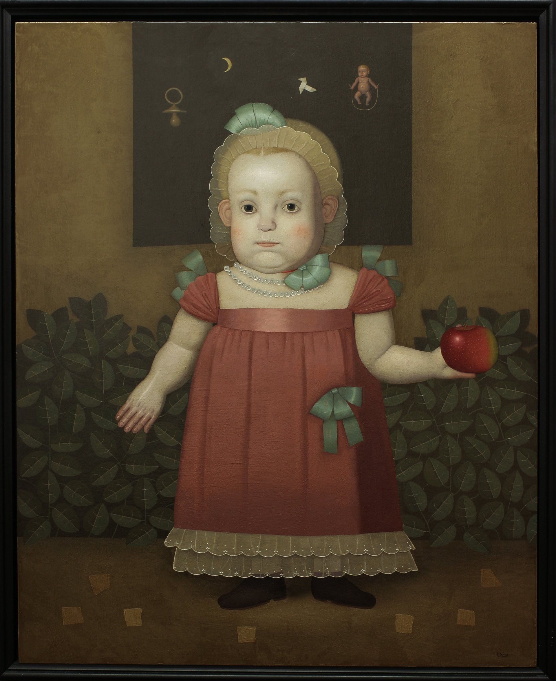‘The universe was hiding in every corner. She appeared, I saw her, she was an infant whom I followed with steps of silence. I was seduced by her handsome attire: she wore flower crowns in her hair and pearl necklaces made from dewdrops; on her dress, silk lace embroidered with crystal threads. But her expression was from a lost world. She was accompanied by a serious dog, but with an expression of wisdom. He walked among the trees of a symmetrical landscape. The world was smiling at her, but she was behind it all: she was not born for homage.’