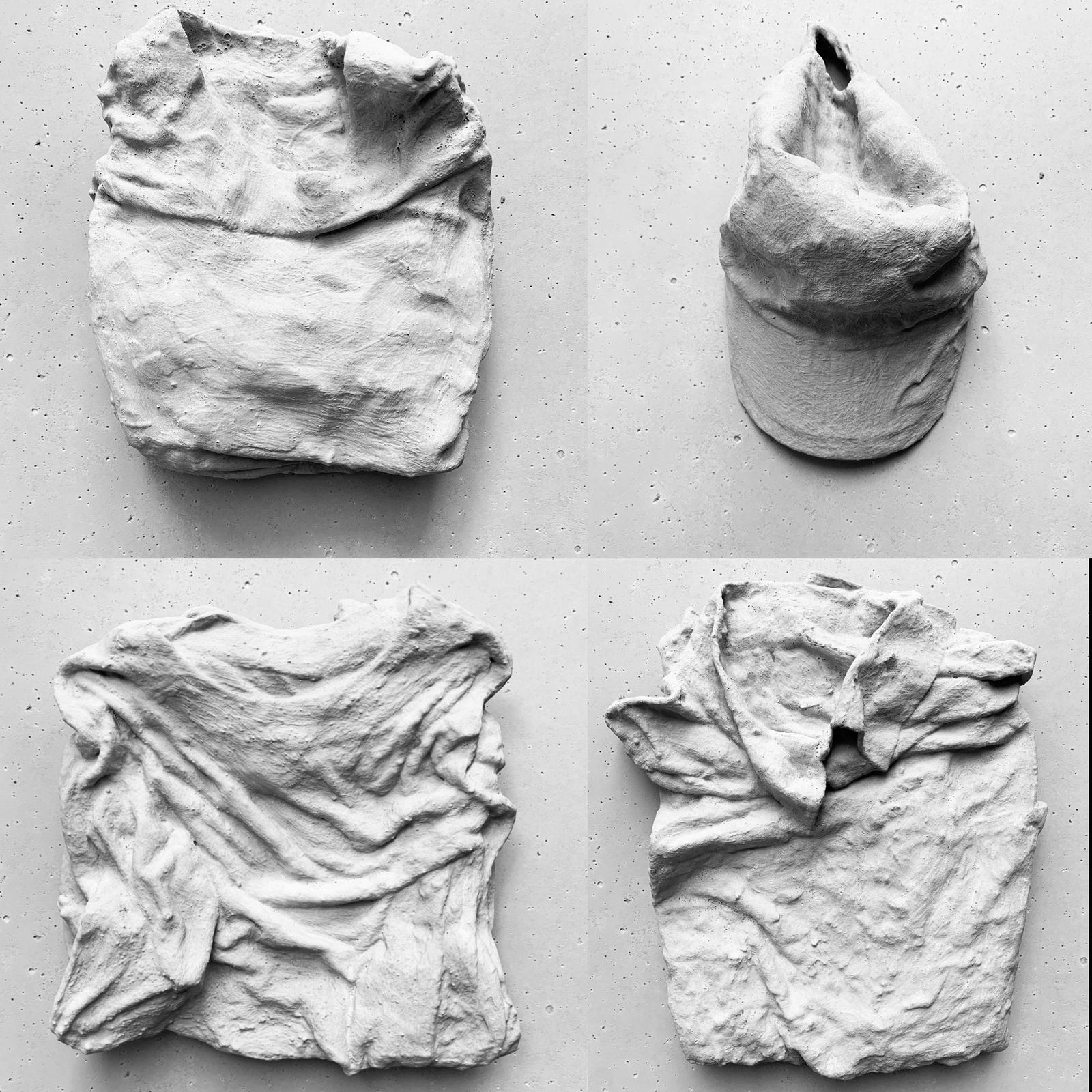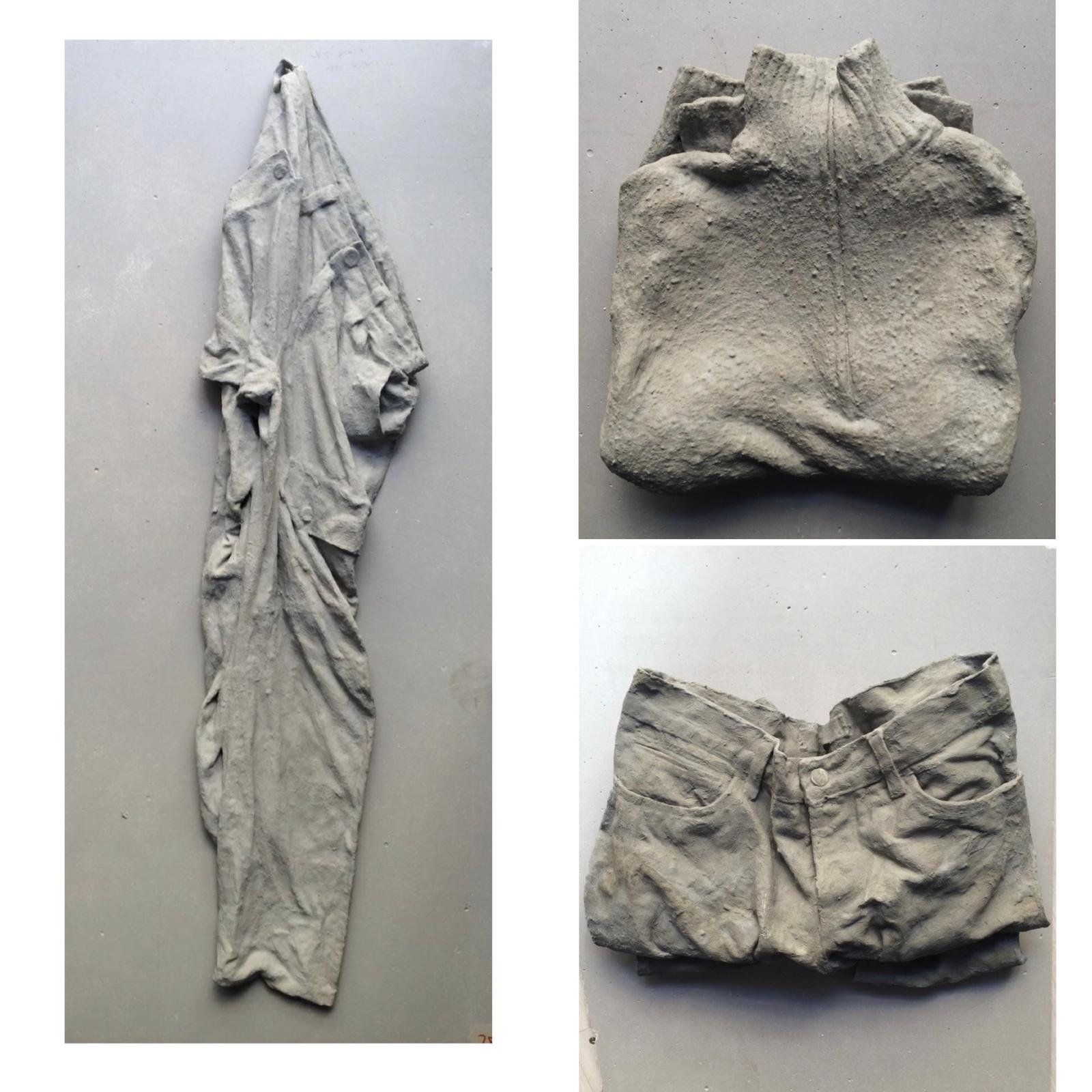 For my Concrete Sculptures I use my personal clothing. Throughout some artistic process, in which I use plaster, resin and cement, I transform them into artworks to hang. My memory, my DNA, my memories stay concreted inside, transforming the person that looks at the artworks into a type of post-modern archaeologist who studies my work as if they were urban artefacts. I love graffiti, I really like to study their communicative methods.