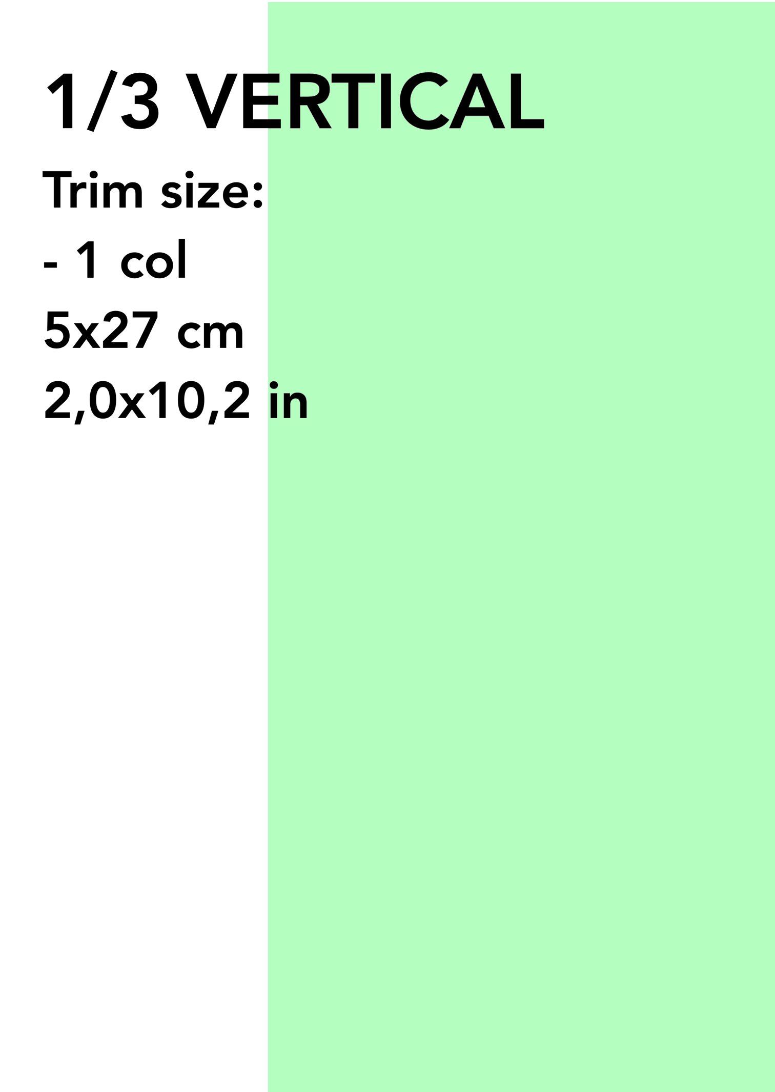 - (3) 1/3 VERTICAL: Trim size: - 1 col 5x27 cm (2,0x10,2 in) € 850 (US$ 917)*