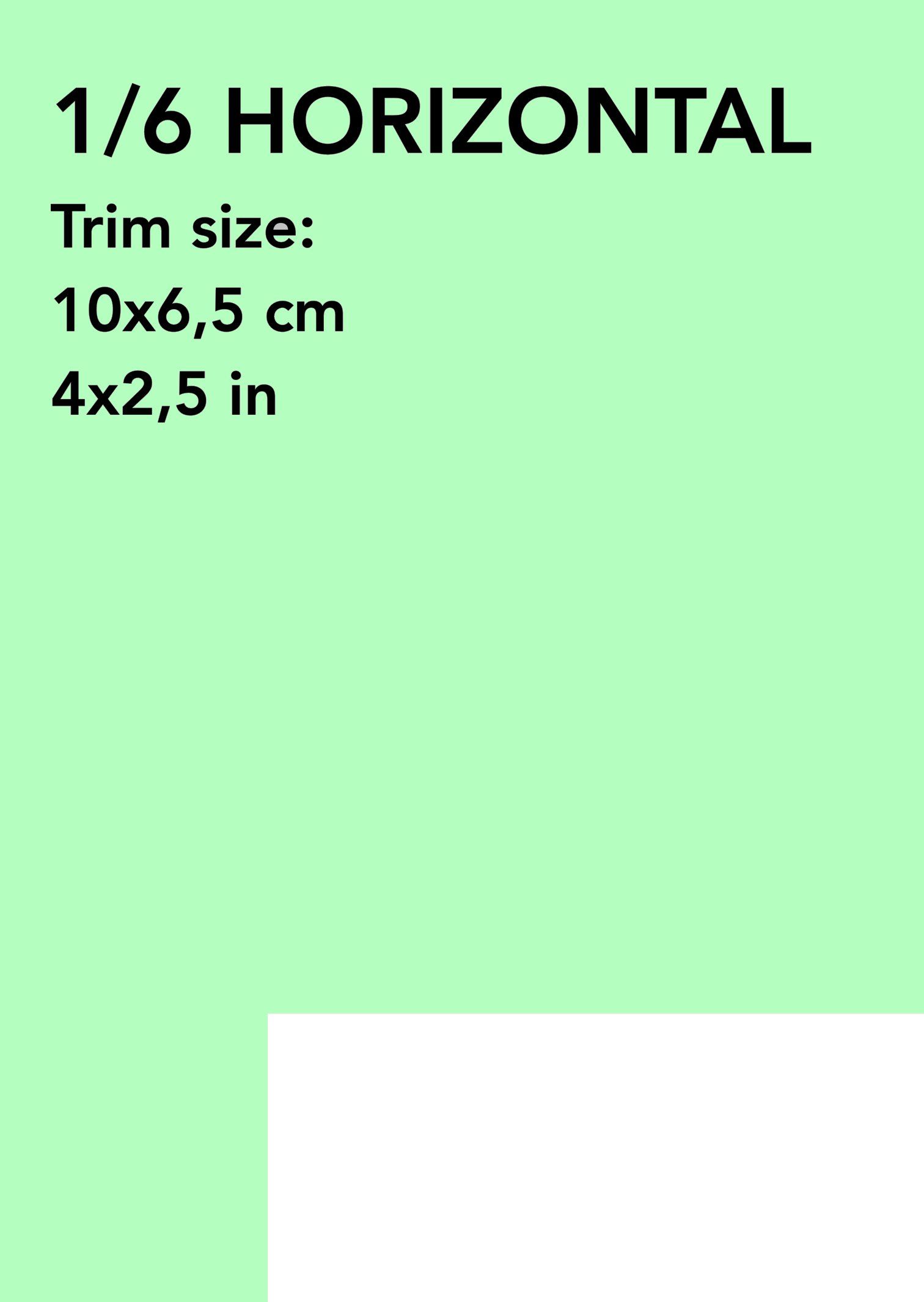 - (5) 1/6 HORIZONTAL: Trim size: 10x6,5 cm (4x2,5 in) € 620 (US$ 669)*