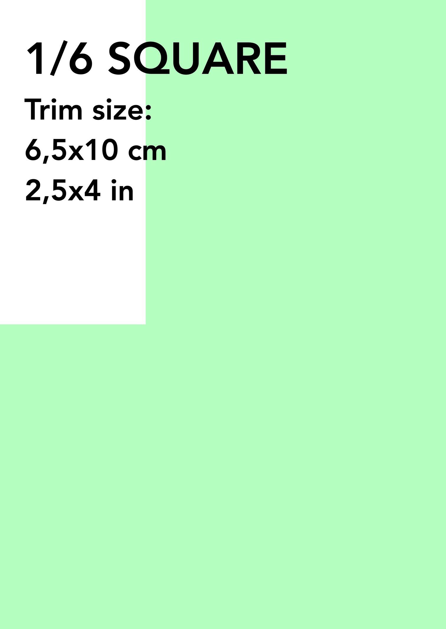 - (6) 1/6 SQUARE: Trim size: 6,5x10 cm (2,5x4 in) € 620 (US$ 669)*