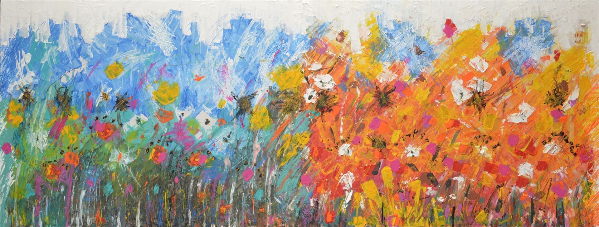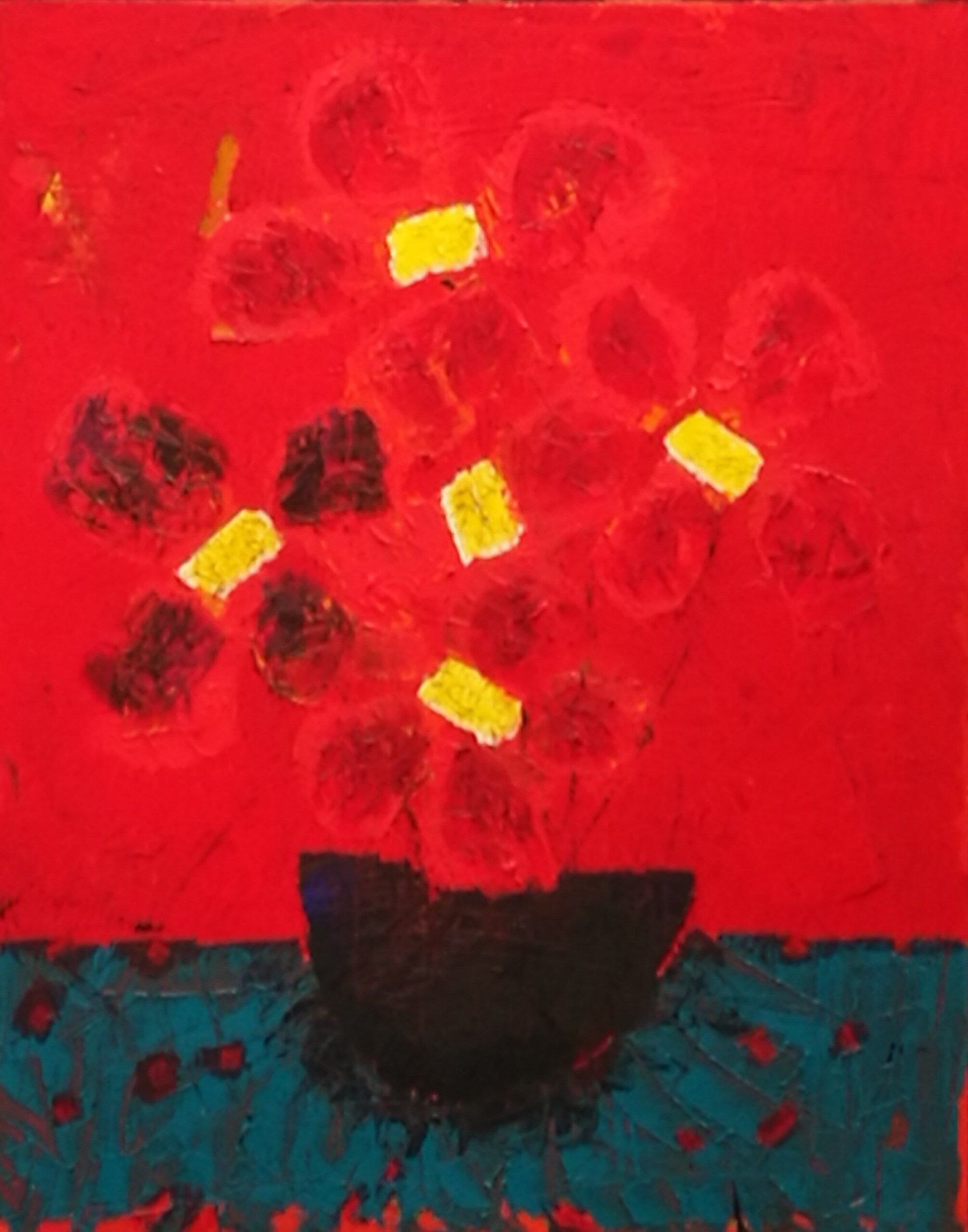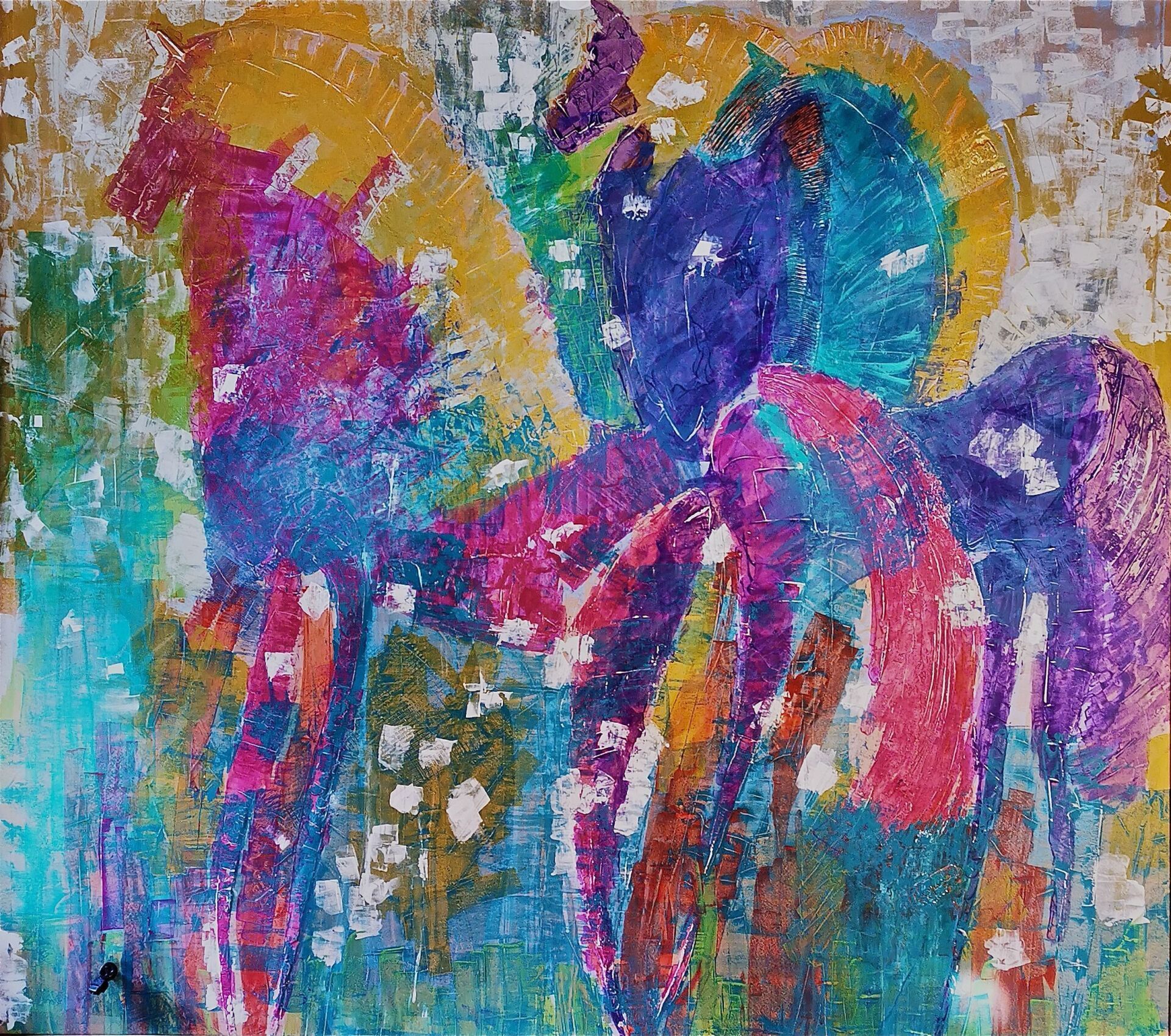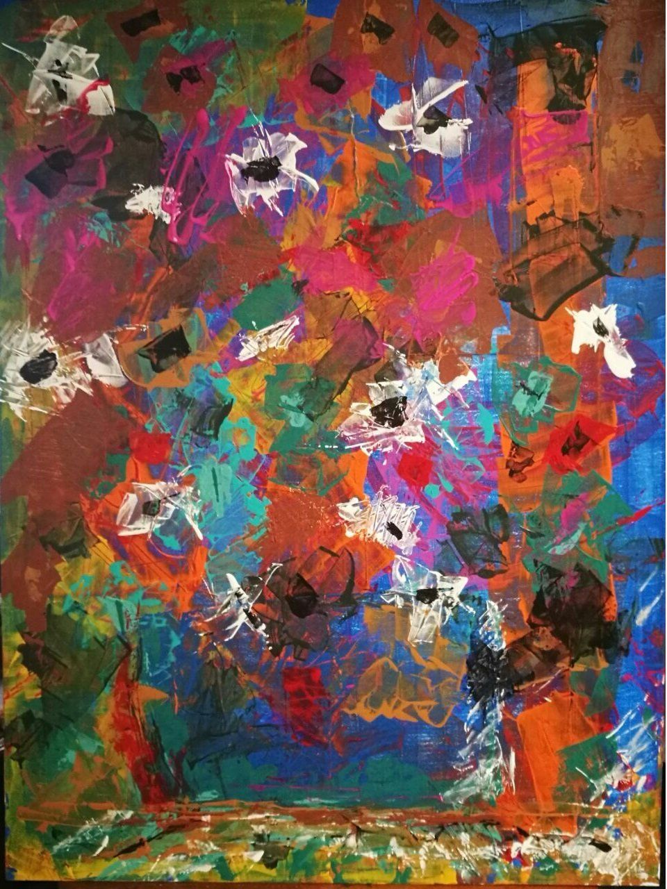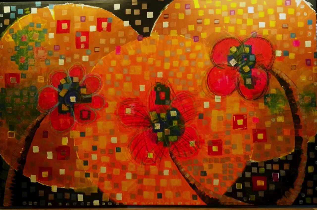 Most of his art is paint with oils and acrylic. The use of bright and vibrant colours instils the balance between the tangible and spiritual.