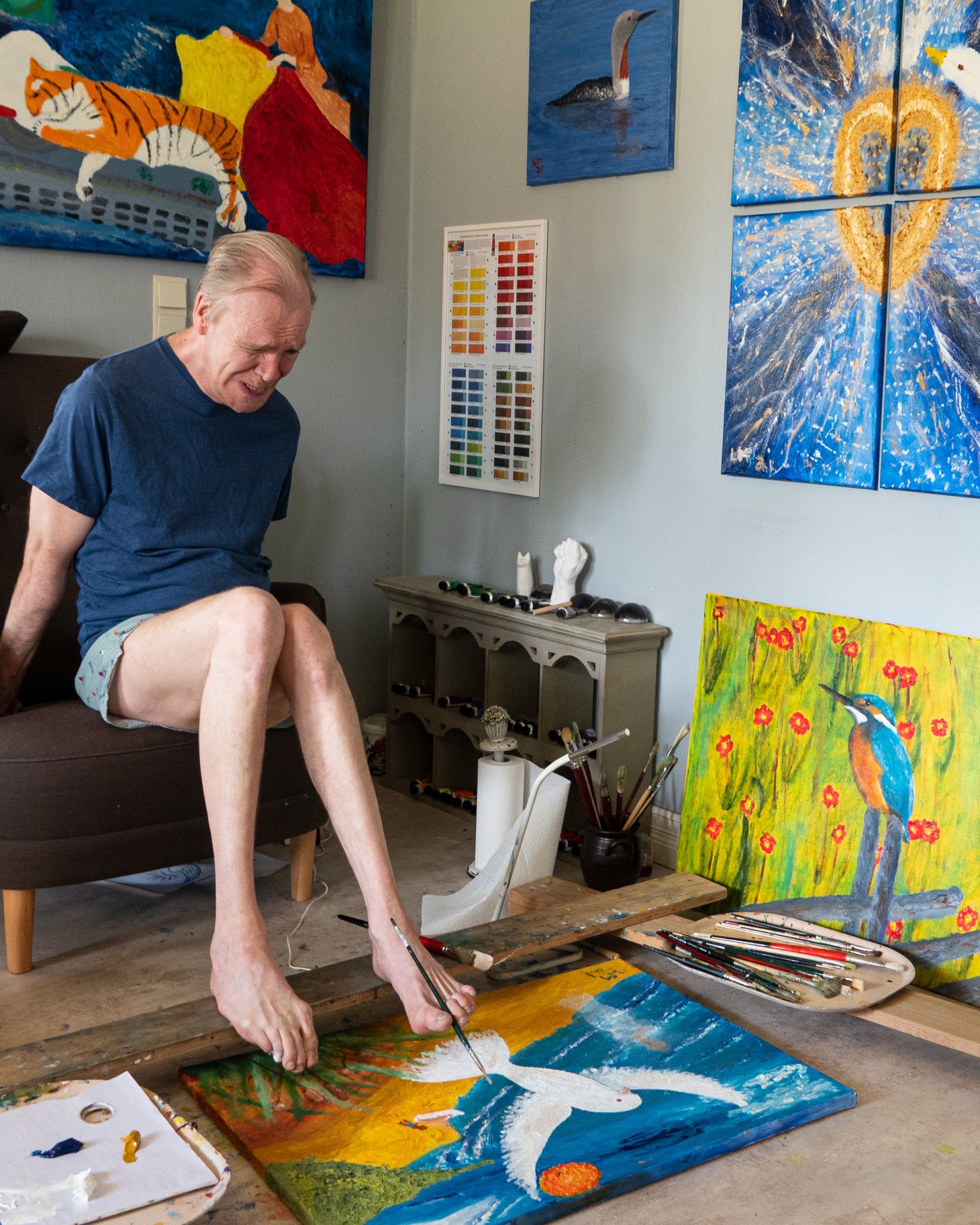 He’s constantly moving, sitting on his hands to prevent the arms flying away. He has the canvas on the floor and paints the most powerful paintings with his feet.
