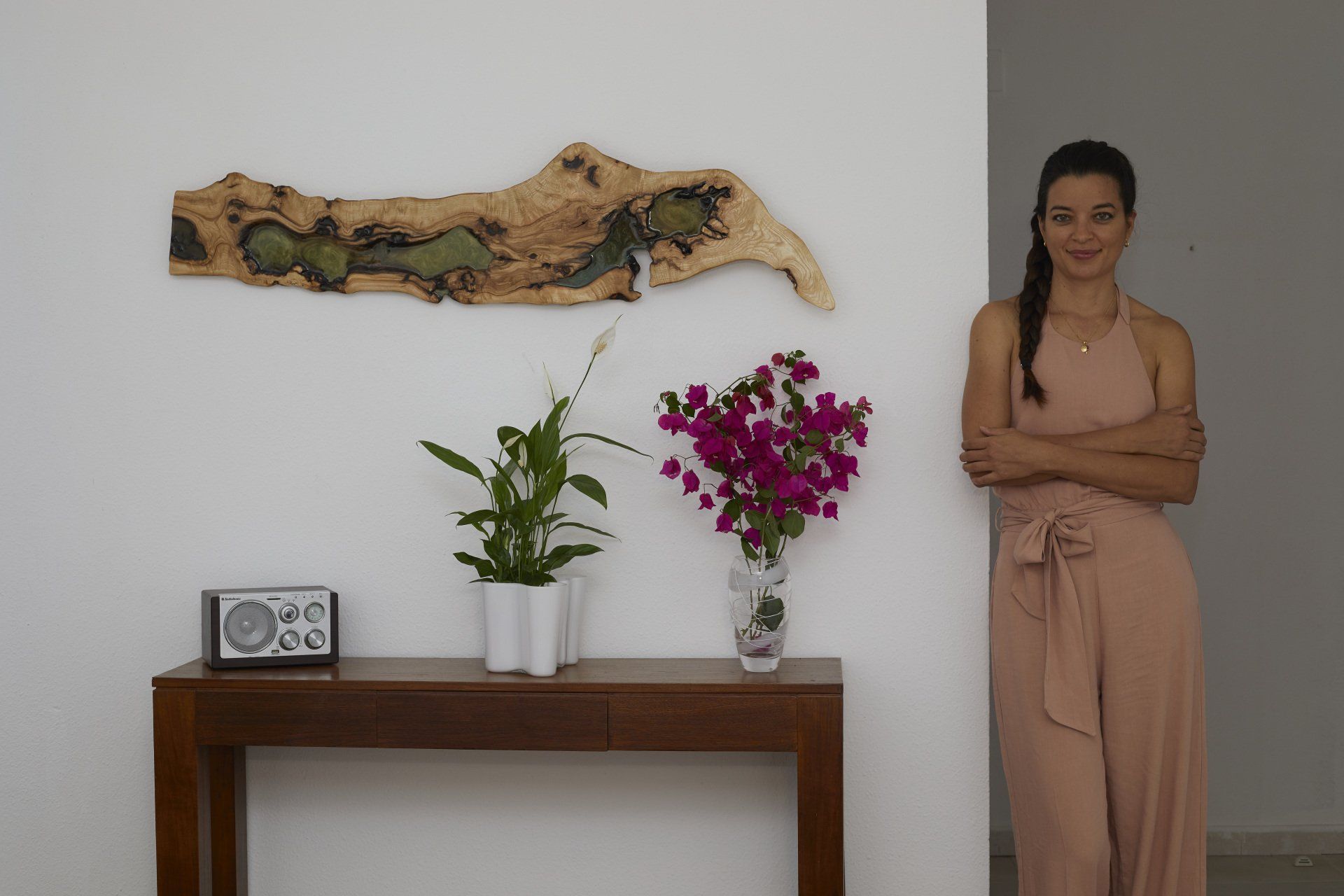 She worked on a series of pieces from trees which had suffered electrical storms in Russia. Those twisted, burned, and forgotten logs were the raw material she was looking for. The strength of these elm wood fragments, were struck by the fury of nature, appears in almost prehistoric silhouetted forms. This is how the wood and resin become the narrator of the story, always respecting, and caring for the environment.